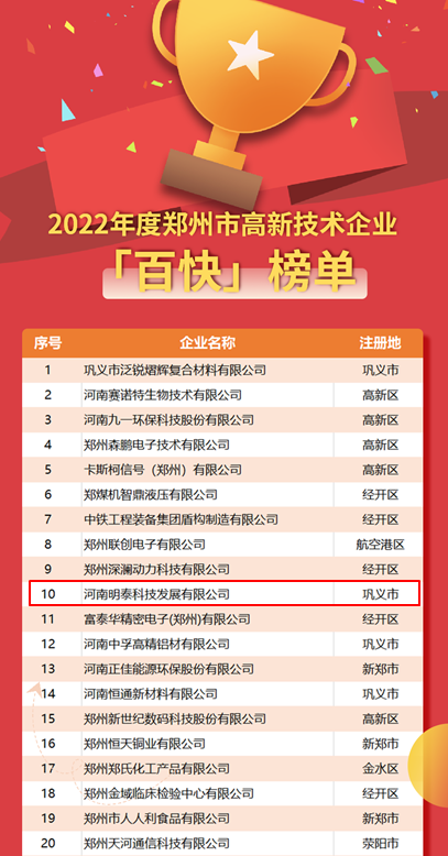 12月29日,鄭州市科學(xué)技術(shù)情報研究所發(fā)布2022年度鄭州市高新技術(shù)企業(yè)“雙百”榜單,集團子公司河南明泰科技發(fā)展有限公司作為“老牌”國家高新技術(shù)企業(yè)榮登榜單。